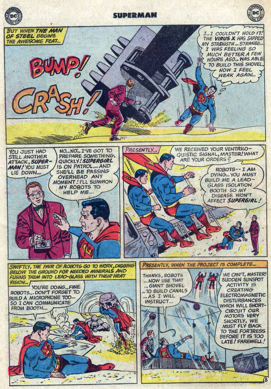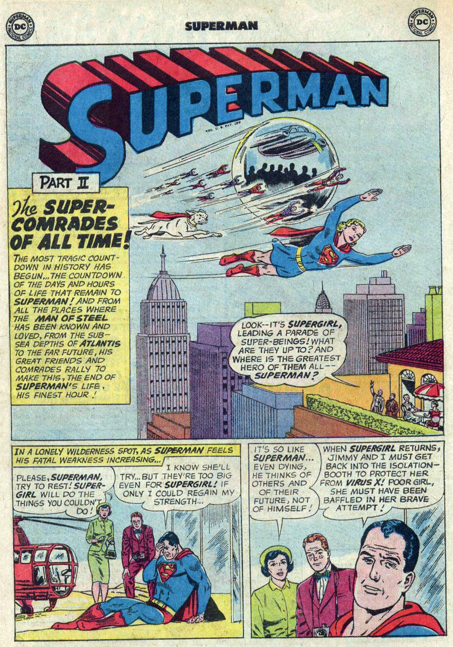 Gdy bezzałogowy satelita kosmiczny zagraża uderzeniem w tajemniczy obiekt znajdujący się na orbicie, Jimmy Olsen wzywa Supermana, by interweniował. Superman przesuwa satelitę, po czym odkrywa, że obiekt jest nasycony zielonym kryptonitem i zawiera próbkę wirusa X — śmiertelnej choroby kryptonijskiej. Używa odrzuconego napędu rakietowego satelity, by skierować obiekt nad opuszczony obszar Metropolis, gdzie wraz z Jimmym przeczytują napis na ciekłym obiekcie. Gdy Superman rozbija obiekt kamieniem, parę fragmentów zostaje rozsypanych — a potem Superman zaczyna odczuwać osłabienie, zdając sobie sprawę, że mógł zostać zainfekowany wirusem.