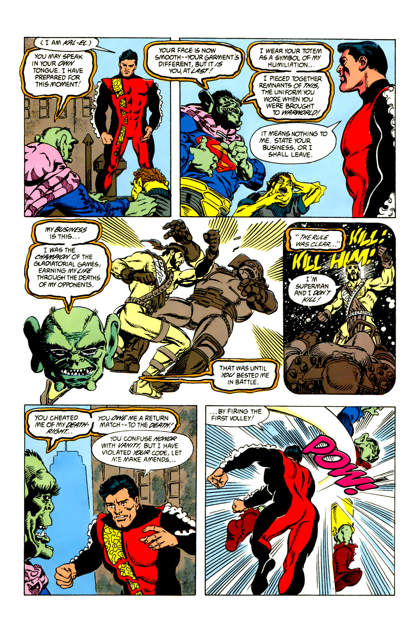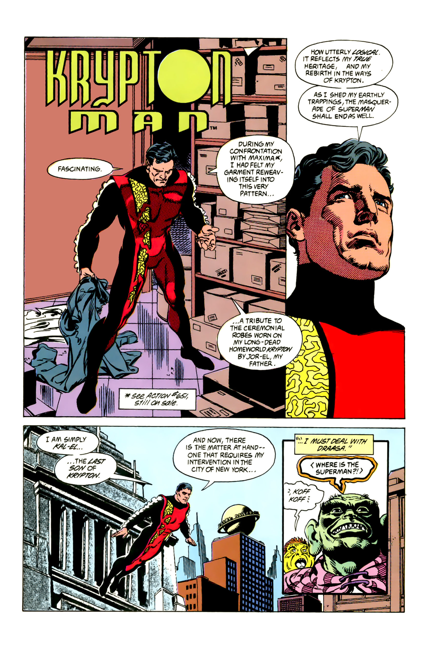 Akcja rozpoczyna się, gdy kosmiczny wojownik Draaga przybywa na Ziemię z żądaniem pojedynku ze Supermanem. Draaga twierdzi, że Superman odebrał mu prawo do własnej śmierci („death right”), i domaga się rewanżu na śmierć. Clark Kent, zirytowany biurową monotonią i wezwany do działania, zrywa z siebie cywilne ubrania — zamiast klasycznego stroju Supermana przywdziewa ceremonialny strój kryptonijski — i wychodzi, by odpowiedzieć na wyzwanie Draagi.