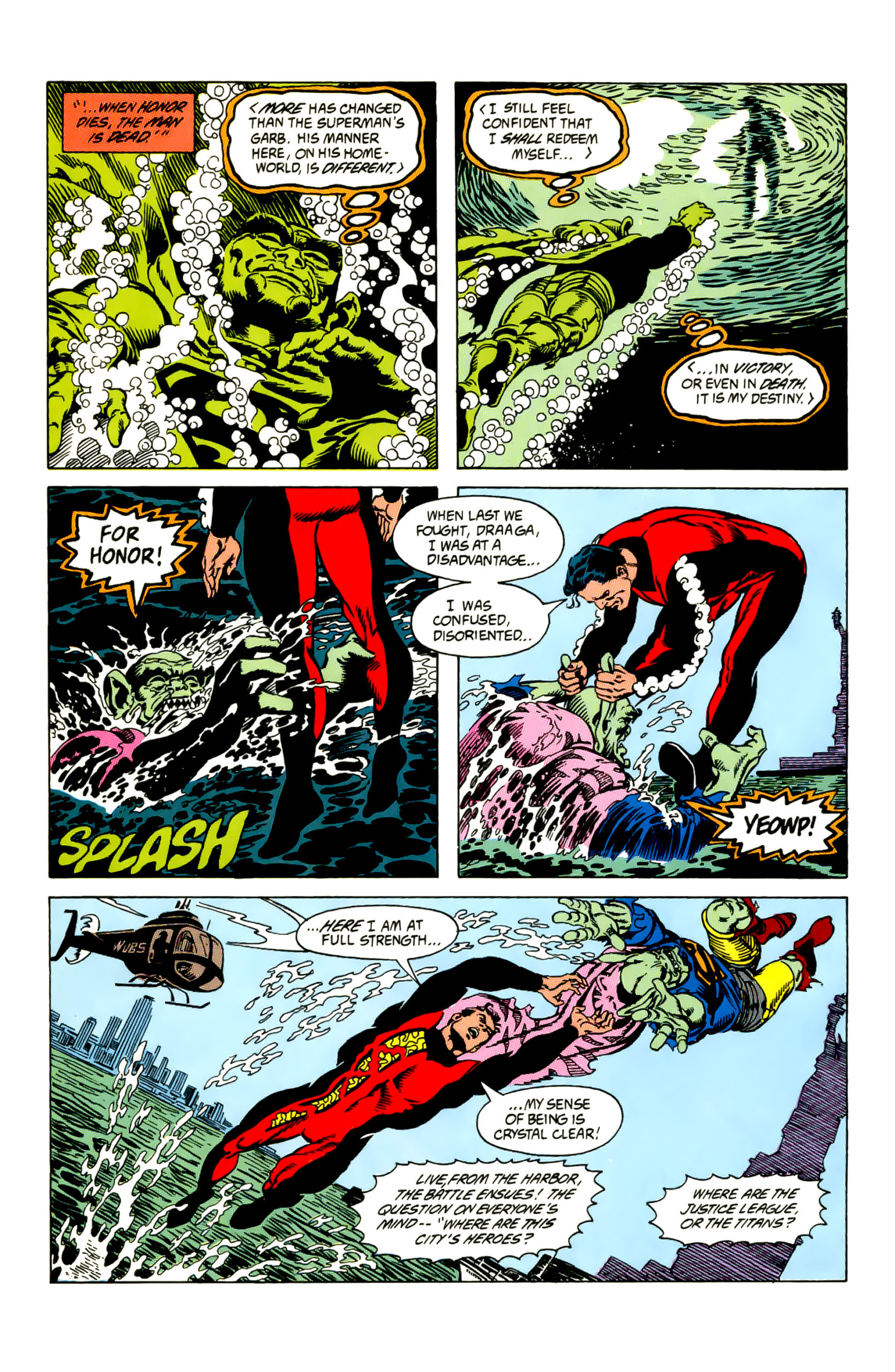W kluczowym momencie Emil Hamilton, obserwując transmisję telewizyjną z walki, podejmuje próbę ograniczenia szkód, jakie walka może wyrządzić otoczeniu. Używa swoich technologii do teleportowania Supermana i Draagi na Księżyc, by uniknąć zniszczeń na Ziemi, lecz błąd w kalkulacjach sprawia, że teleportacji ulega również połowa Statuy Wolności. Superman pokonuje Draagę — wydaje się, że zwycięstwo to może skończyć się śmiertelnie dla Draagi, jednak numer kończy się nim, gdy Superman stoi gotów wymierzyć przeciwko niemu ostateczny cios, a publiczność i świat oczekują, co dalej.