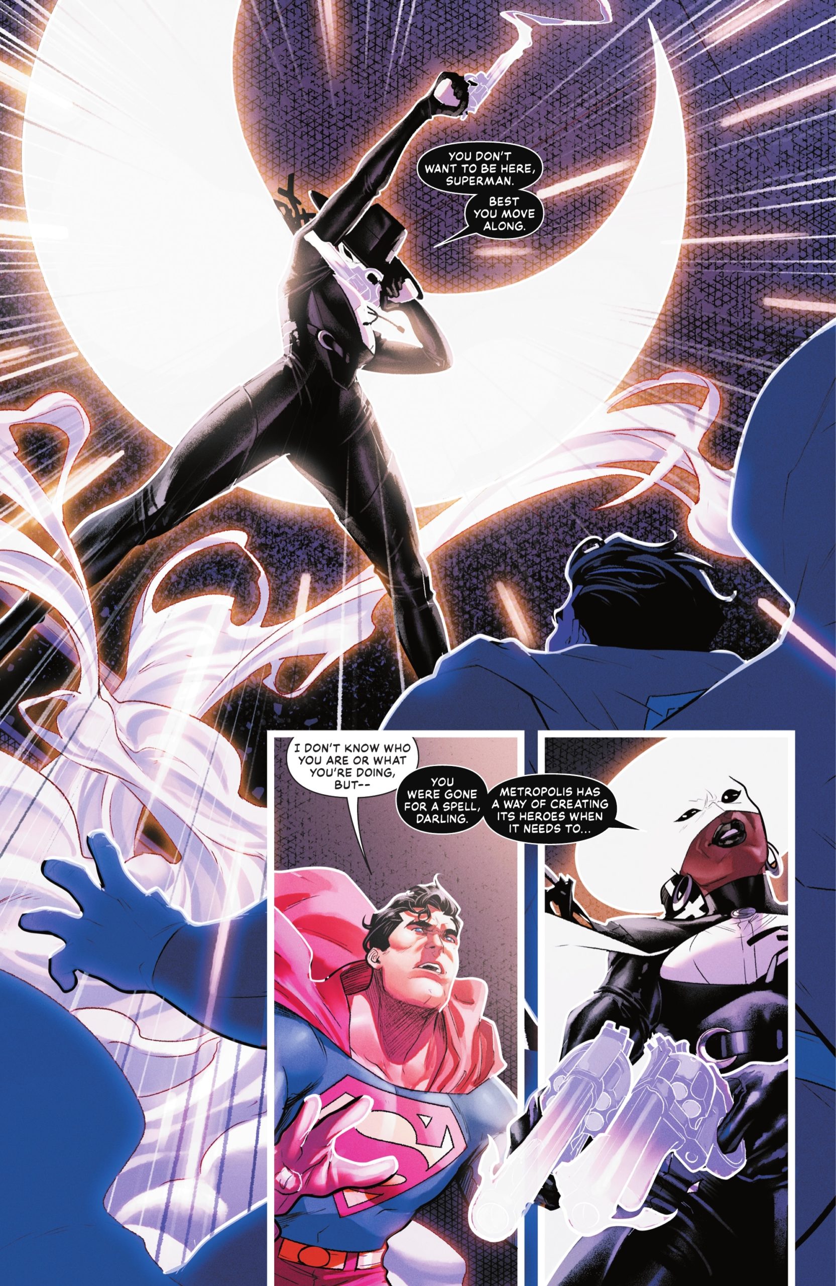 Superman, wciąż osłabiony i pozbawiony pełni sił, zostaje niespodziewanie uratowany przez tajemniczą kobietę – Marilyn Moonlight – nową postać o eterycznej, niemal duchowej prezencji. W jej obecności Clark doznaje wizji przypominającej Dziki Zachód, gdzie Moonlight wręcza mu „światło” – energetyczny zastrzyk, który na moment przywraca mu siły. Kobieta znika równie szybko, jak się pojawiła, pozostawiając Supermana z pytaniami bez odpowiedzi.