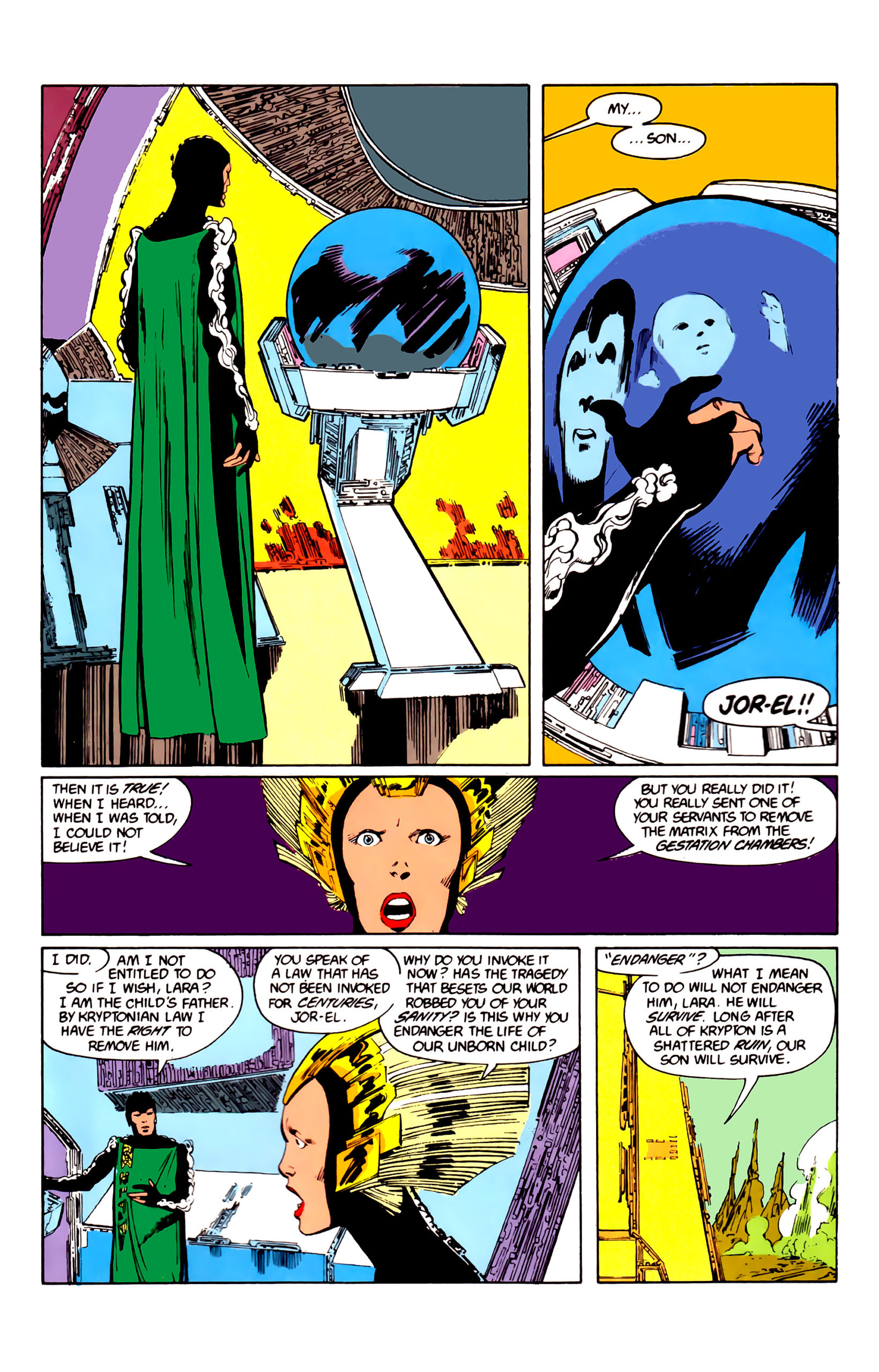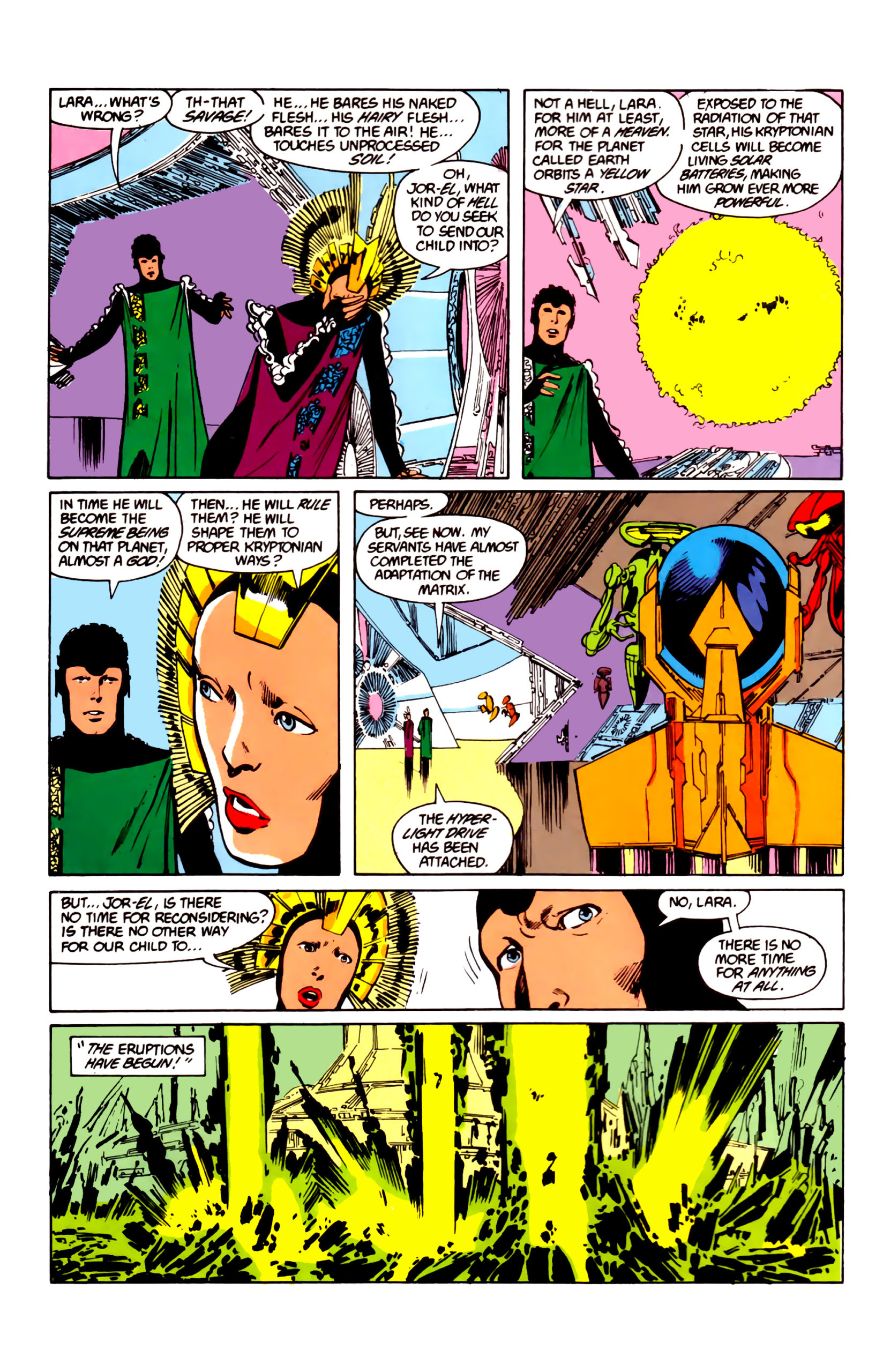 Na Kryptonie naukowiec Jor‑El odkrywa, że planeta stoi w obliczu katastrofy: w wyniku reakcji łańcuchowej w jądrze dochodzi do fuzji pierwiastków, co prowadzi do powstania radioaktywnego materiału, skazując Krypton na zagładę. W obawie o przyszłość swego nienarodzonego syna, umieszcza Kal‑El w specjalnej „birthing matrix” — urządzeniu wspomagającym rozwój i podróż w kosmos. Lara, jego żona, przybywa na miejsce i wpada w przerażenie, gdy widzi, że ich dziecko ma zostać wysłane w przestrzeń. Jor‑El tłumaczy jej, że musi zabezpieczyć przyszłość dziecka poza Kryptonem — statek rusza ku Ziemi, gdy planeta eksploduje.
